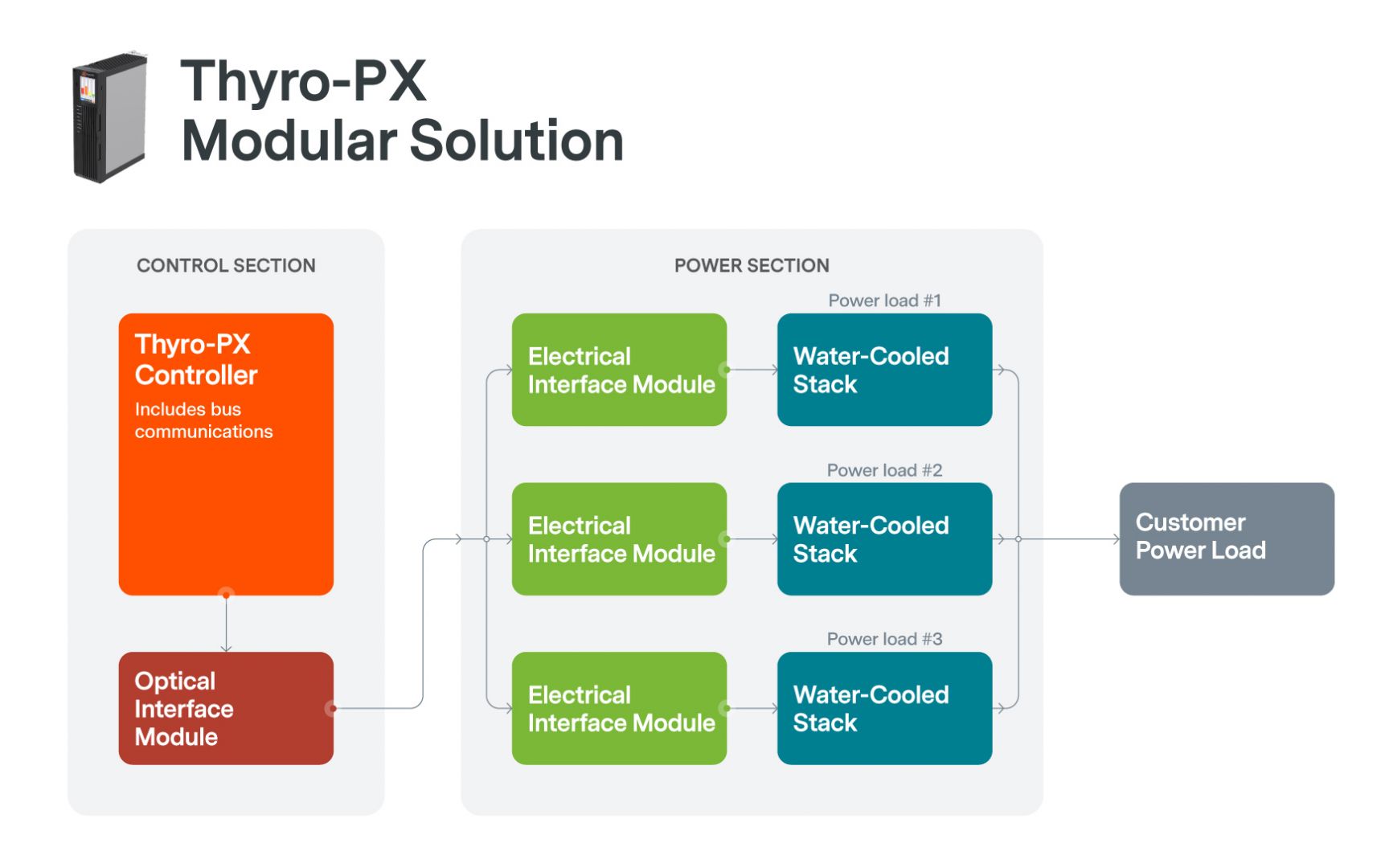 Thyro-PX Modular Solution je distribuovaná architektúra, ktorá umožňuje jednoduchú inštaláciu prispôsobeného systému regulácie výkonu SCR pre aplikácie s vysokým prúdom AC a DC.